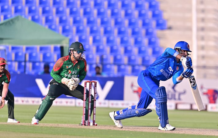 আবুধাবির জায়েদ স্টেডিয়ামে ১৯১ রানের সহজ লক্ষ্যে ব্যাট করতে নেমে শুরু থেকেই পথ হারায় বাংলাদেশ। প্রথম ওভারেই তানজিদ হাসান তামিম (০) আউট হওয়ার পর টপ অর্ডারে নামে আসা-যাওয়ার মিছিল। আজমতউল্লাহ ওমরজাইয়ের গতি আর সুইংয়ে একে একে ফিরে যান নাজমুল হোসেন শান্ত (৭), সাইফ হাসান (২২) ও অধিনায়ক মেহেদী হাসান মিরাজ (৪)। মাত্র ৫০ রানে ৪ উইকেট হারিয়ে শুরুতেই ম্যাচ থেকে ছিটকে পড়ে বাংলাদেশ।