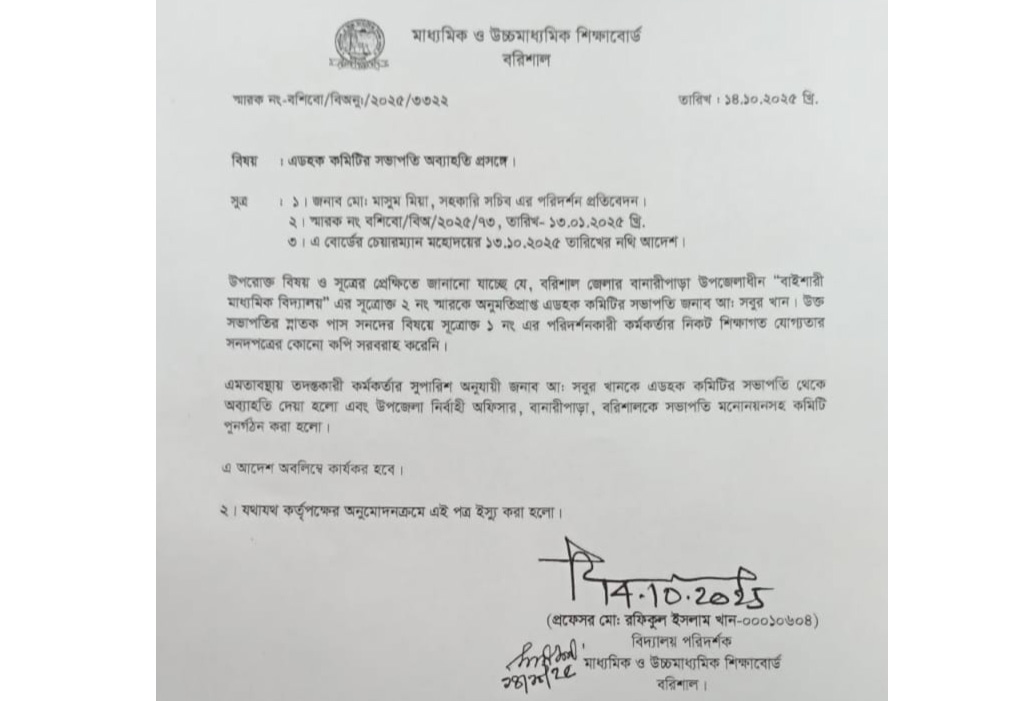 বুধবার (১৫ অক্টোবর) সকালে বিদ্যালয়ের ভারপ্রাপ্ত প্রধান শিক্ষক মোস্তফা কামাল সভাপতি পদ থেকে সবুর খানকে বাদ দেওয়া সংক্রান্ত বোর্ডের চিঠি পাওয়ার তথ্য নিশ্চিত করেন। বোর্ডের বিদ্যালয় পরিদর্শক প্রফেসর মো. রফিকুল ইসলাম খান স্বাক্ষরিত ওই পত্রে সবুর খানকে বাদ দিয়ে উপজেলা নির্বাহী অফিসার মো. বায়েজিদুর রহমানকে সভাপতি মনোনীত করে বাইশারী মাধ্যমিক বিদ্যালয়ের ম্যানেজিং কমিটি পুনর্গঠন করা হয়েছে।