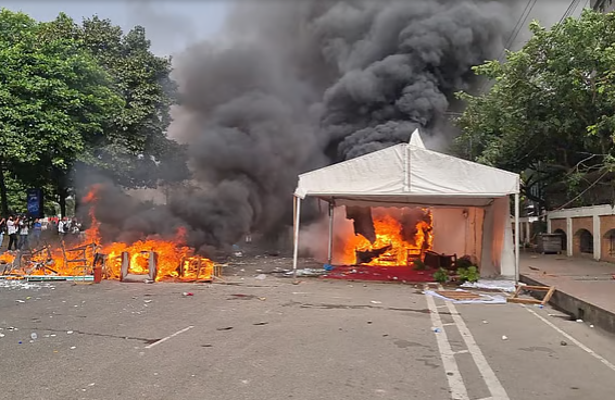 বিক্ষুব্ধ জুলাই যোদ্ধারা সংসদ ভবনের ১২ নম্বর গেট ভেঙে ফেলেন। তারা বাইরে বের হয়ে বেশ কয়েকটি ট্রাক ও বাস ভাঙচুর করেন। পরিস্থিতি নিয়ন্ত্রণে টিয়ারশেল নিক্ষেপ করে পুলিশ।