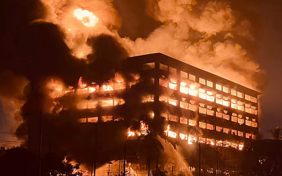 আগুন লাগা ভবনের আট তলার ছাদ ধসে পড়েছে, ভেতরে থেমে থেমে বিস্ফোরণ ঘটছে। এতে আগুন নিয়ন্ত্রণে বড় বাধা তৈরি হয়েছে। প্রচণ্ড তাপে ফায়ার সার্ভিস সদস্যরা ভবনের কাছে যেতে পারছেন না, দূর থেকে পানি ছিটিয়ে আগুন নেভানোর চেষ্টা চলছে।